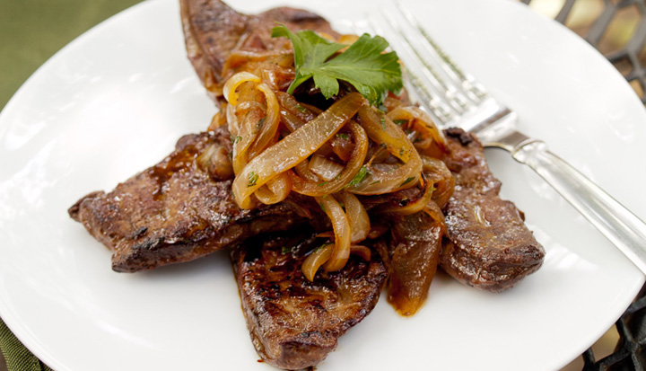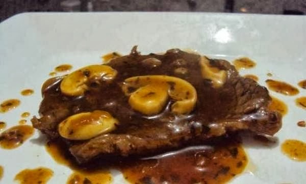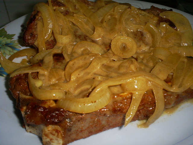 Na mesma frigideira, regar mais azeite e dourar a cebola depois disso adicionar o molho inglês e os bifes.
