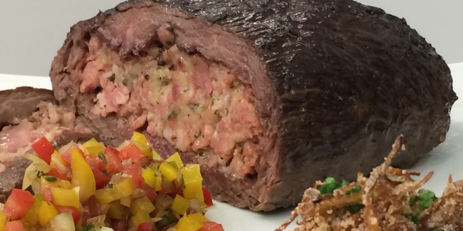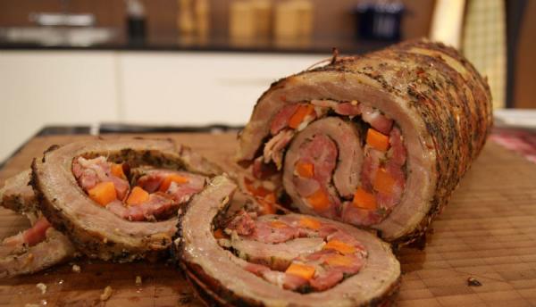 Colocar no centro de cada um dos bifes, 1 bastão de cenoura, 1 fita de bacon e 1 de pimentão. Fechar com ajuda de um palito.